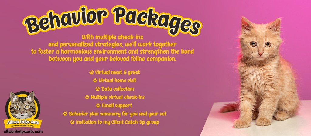 - Virtual Client Group Catch-Up: Offers opportunity to chat with other clients and to ask questions for issues not covered in consultations. Group calls will only address issues relevant to your original case; new cases will require a new consultation package. This service is only available to clients who have reviewed Allison Helps Cats on Google.